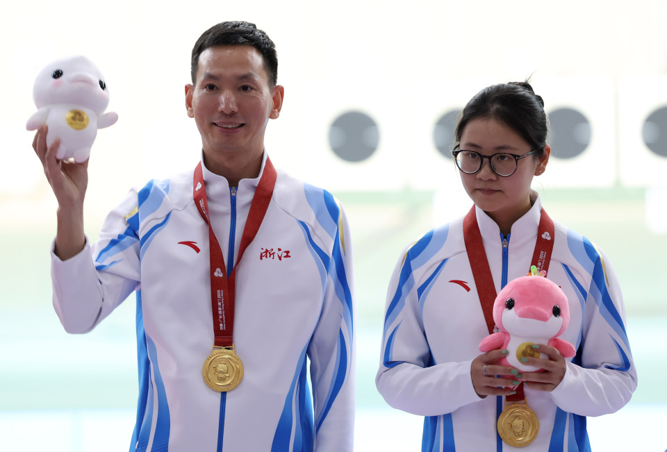 当日,第十五届全运会射击女子10米气步枪决赛在广州举行。10月13日,冠军浙江队选手韩佳予(右三)、亚军江苏队选手颜金婧(左二)、季军辽宁队选手杜雨宸(右二)及教练在颁奖仪式上。新华社记者 卢汉欣 摄
